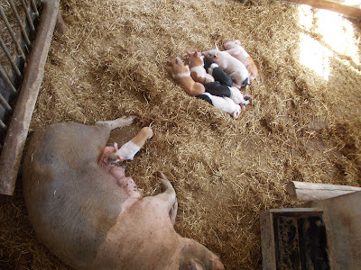 Nguruwe ananyonyesha mtoto na wengine wakiwa wamelala kwa pamoja pembeni ya mama yao. Tazama wana mchanganyiko wa rangi, nyeupe, nyeusi na kahawia rangi ambayo ni adimu kuikuta hasa hapa kwetu. Chini zimetandazwa nyasi raini ambayo yanasaidia kuwapa joto na wasiumie kwenye sakafu. Nyasi hubadilishwa kila zinapokuwa zimeharibika au kuwa na unyevunyevu.